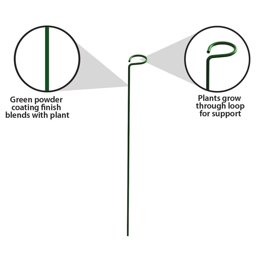 18in Plant Prop is designed to help stabilize plants and provide protection from wind and rain damage. The plant prop features a powder coating to help prevent rusting and corrosion and for longer lasting life so it can be used year after year. The green color finish blends in with its surroundings making it a discrete option. Quick and easy to install, simpy push the plant prop into the ground, firmly holding the bottom portion of the stake and feed the plant stem into the opening at the top. Not for recommended use with top-heavy plants. For increased stability, drive stake further into the ground by firmly holding the plant stake at the bottom with one hand and gently pushing on the top with the other hand (see photos for example). Available in 18in., 24in, and 36in heights.