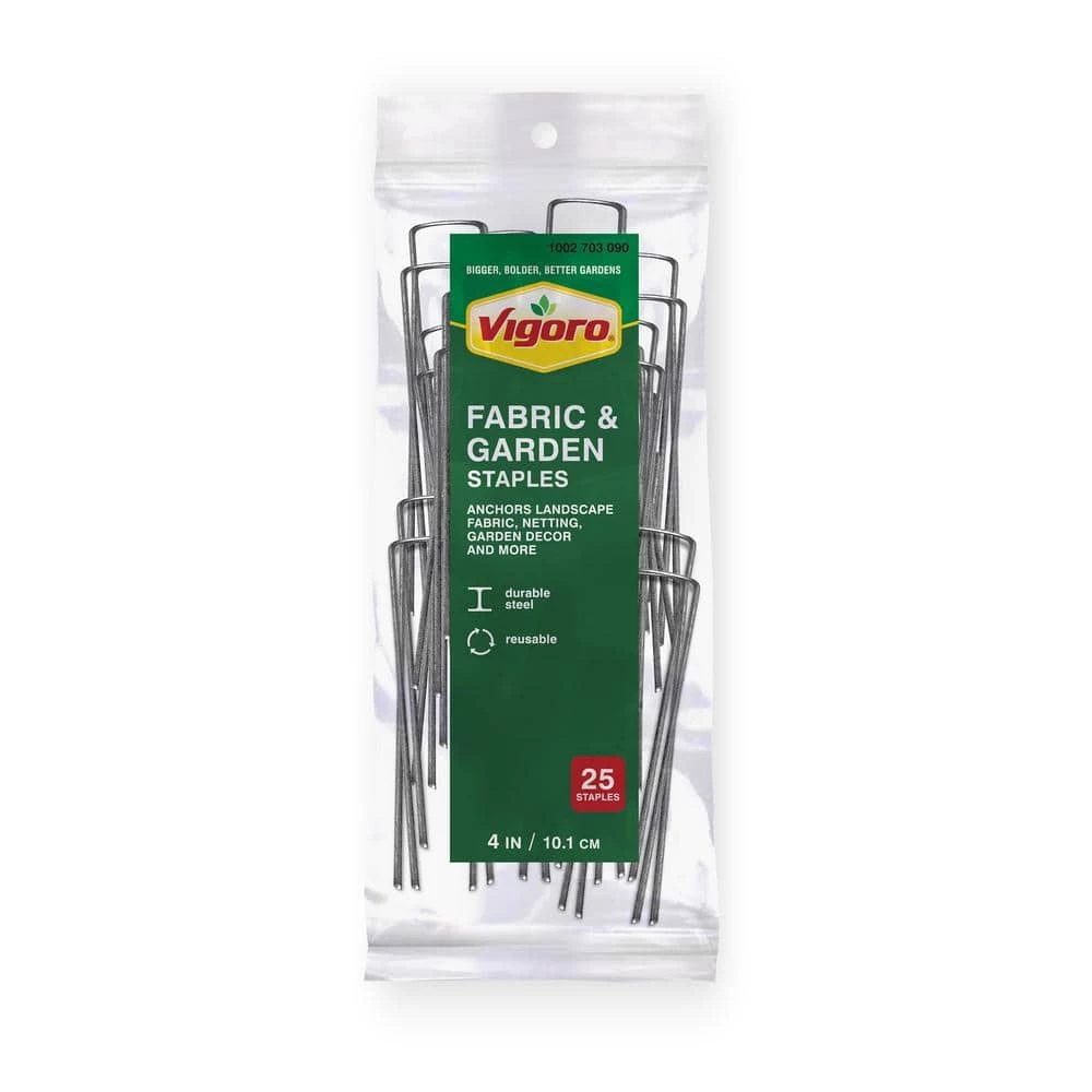 Keep your backyard looking clean and organized with Vigoro Landscape Fabric Staples. These landscape pins are the gardening accessory needed for every landscaping project. Not only are they extremely heavy-duty, but they can also be used for different projects around your yard such as holding securing landscape fabric, nettings, plant protection blankets, fencing, tarps or tents. You simply position fabric pin every 8 in. to 10 in. to keep fabric properly stable, press into surface and then use hammer to secure.